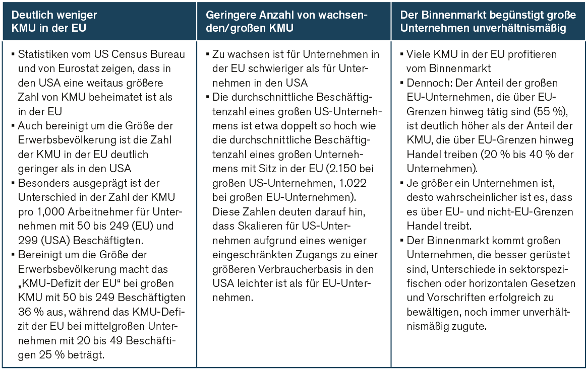 Die meisten Unternehmen in Deutschland und in der EU sind KMU. Die Unternehmensstatistiken zeigen jedoch auch, dass es in den USA trotz einer deutlich geringeren Gesamtbevölkerung eine weitaus größere Zahl von KMU gibt als in der EU. Auch bereinigt um die Größe der Erwerbsbevölkerung ist die Zahl der KMU in der EU deutlich geringer als in den USA. Das „KMU-Defizit“ der EU bei großen KMU (50 bis 249 Beschäftigte) beträgt 36 %, während das KMU-Defizit der EU bei mittleren KMU (20 bis 49 Beschäftigte) 25 % beträgt (Tabelle 4).