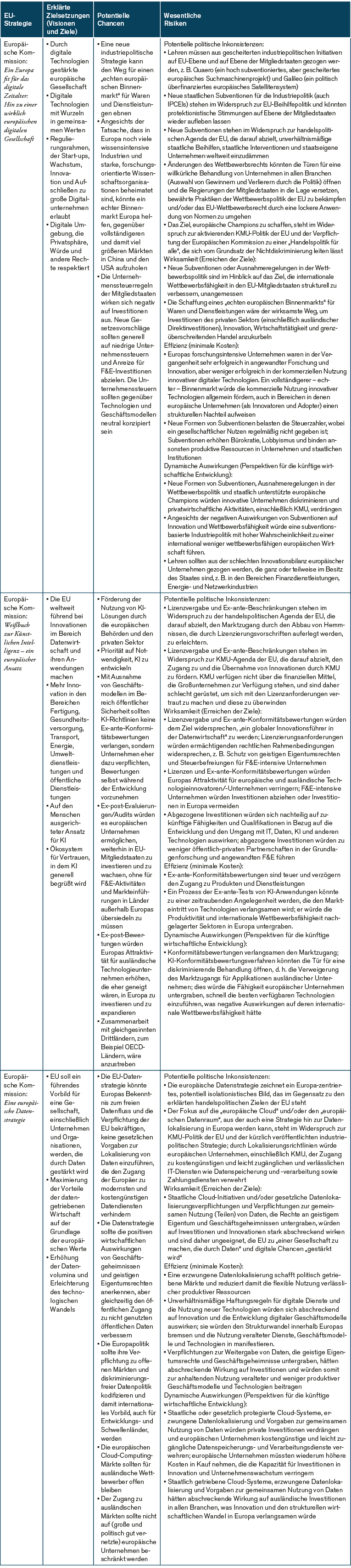 Ein gutes Beispiel dafür, dass es in Gesetzgebungsprozessen regelmäßig nicht um konsitstente Abwägungen zwischen wirtschaftlicher Freiheit auf der einen Seite und europäischen Werten auf der anderen Seite geht, ist die Debatte über die neuen wirtschaftspolitischen Leitlinien, die die Europäische Kommission im Februar 2020 vorstellte. Darin bestätigt die Kommission formell die allgemein positiven Auswirkungen der Digitalisierung auf die europäischen Gesellschaften. Die Kommission erkennt ferner an, dass in der EU erhebliche Investitionen nötig seien, um die Lücken gegenüber China und den USA zu schließen. Bemerkenswert ist jedoch, dass verschiedene Kommissionsdokumente unterschiedliche und vor allem inkonsistente Strategien zur Erreichung dieser Ziele vorweisen, was darauf hindeutet, dass es bereits schwerwiegende Konflikte zwischen verschiedenen Werten und „Regulierungskulturen“ innerhalb der Europäischen Kommission gibt. Während der (französische) Binnenmarktkommissar eine eher interventionistische Datenstrategie darlegte, stellte die (dänische) Kommissarin für Wettbewerb und digitale Strategie in ihrer jüngsten Digitalstrategie und dem Weißbuch über künstliche Intelligenz liberalere Ansätze vor. Auch die jüngsten Diskussionen über eine Neuausrichtung der europäischen Wettbewerbspolitik zeigen, dass es in Wettbewerbsfragen ähnliche Konflikte innerhalb und zwischen den EU-Mitgliedstaaten gibt.