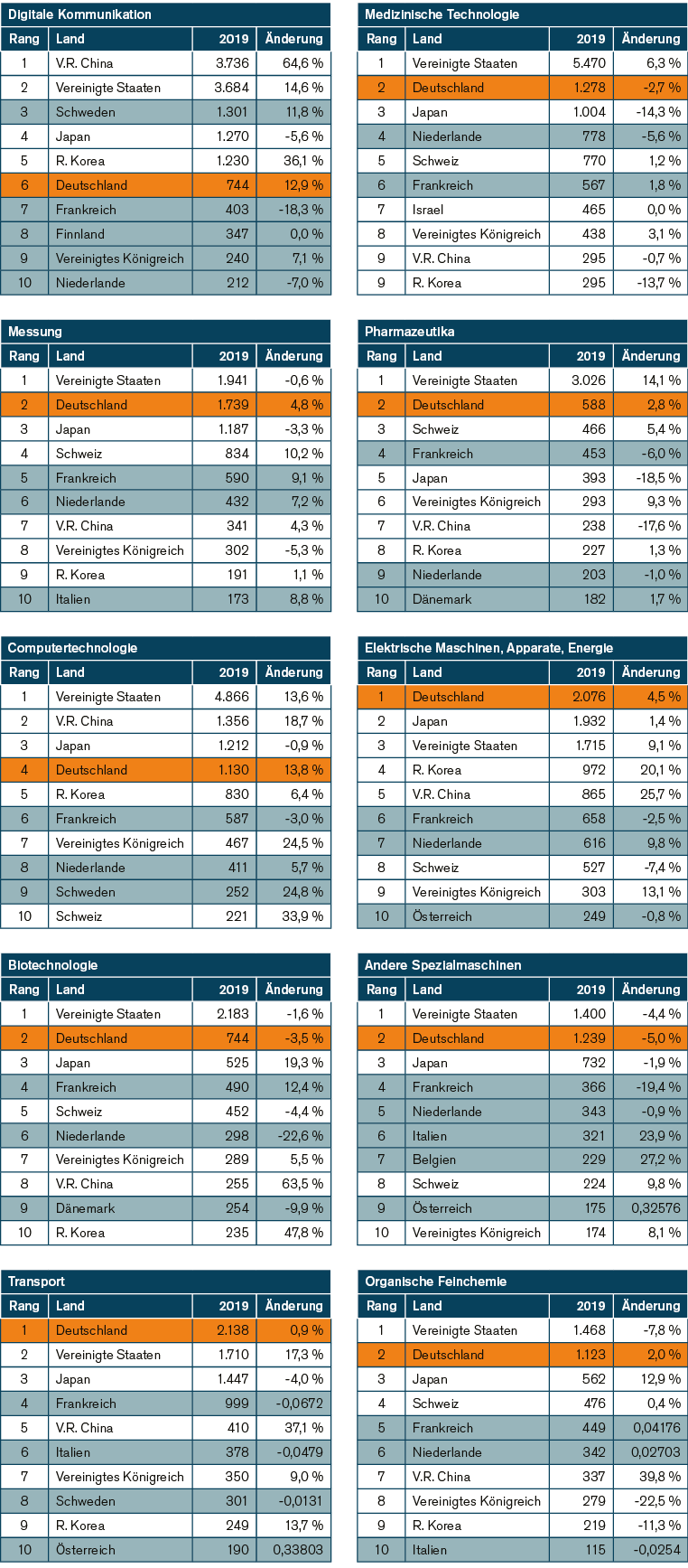 Quelle: Europäisches Patentamt. Hinweis: Veränderungen für Zeitraum 2018–2019 Die europäischen Patentanmeldungen umfassen direkte europäische Anmeldungen und internationale (PCT-)Anmeldungen, die während des Berichtszeitraums in die europäische Phase eingetreten sind. Die Definition der Felder basiert auf der WIPO IPC-Technologie Konkordanztabelle. Die geografische Herkunft basiert auf dem Wohnsitzland des ersten Antragstellers, der auf dem Antragsformular aufgeführt ist (Grundsatz des erstgenannten Antragstellers). In den Fällen, in denen mehrere Bewerber auf dem Antragsformular genannt werden, gilt das Wohnsitzland des ersten aufgelisteten Antragstellers.