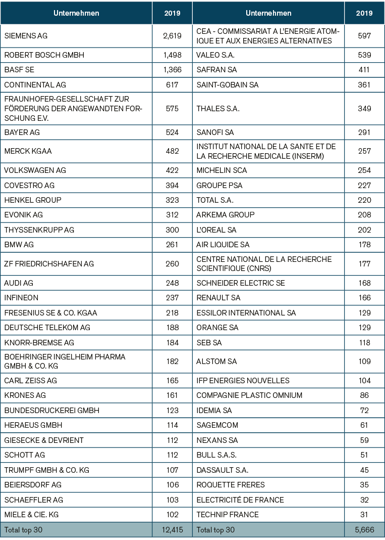 Tabelle 8: Anzahl der Patente nach Unternehmen, Top 30 der Anmelder, Deutschland vs. Frankreich