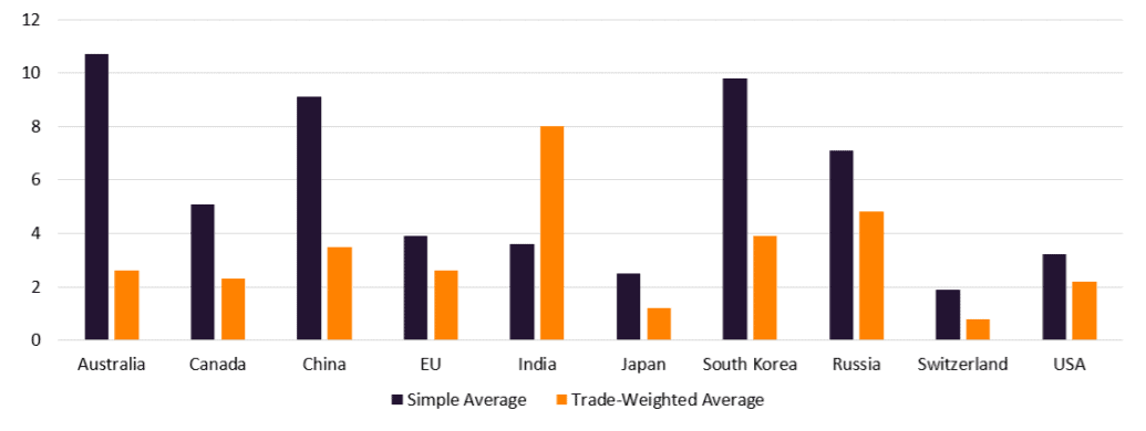 There are different ways to measure the level of tariffs in a country. The simple average tariff includes all tariff lines for a country, but can be distorted by high tariffs on goods that are not-imported. The trade weighted average uses a country’s imports as weights, but can be artificially low as high tariffs impede certain imports.