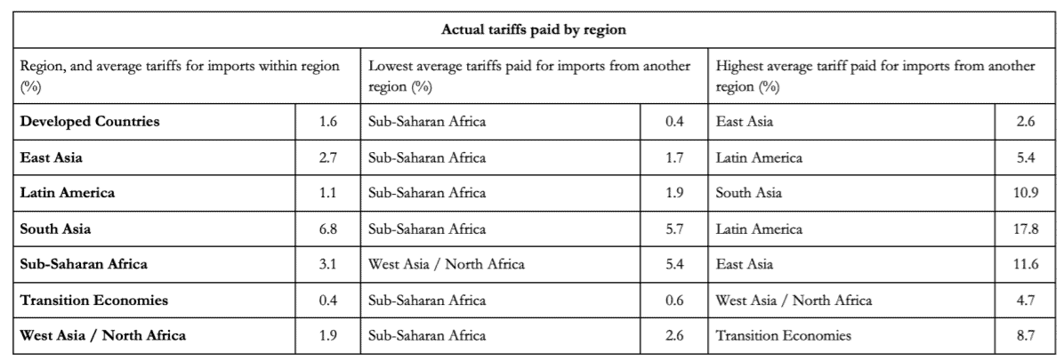 These tariffs, however, are the Most Favoured Nation (MFN) applied in trade with any country as long as there is no bilateral Free Trade Agreement that reduces or eliminates the tariffs. But most countries now have a network of such agreements. UNCTAD’s Tariff Trade Restrictiveness Index takes these into account and shows a much lower actual average tariff paid. It also shows lower rates for intra-regional trade where that network is thicker, and for exports from developing countries given unilateral tariff preferences.