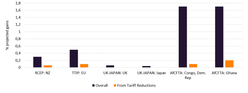 This is indeed what we see when looking at the impact assessments for a number of recent agreements covering both developed and developing countries. The projections are typically positive, but only to a small extent. Where the impact assessments distinguish between the benefits of different content within an agreement, the tariff element is typically the lowest. Thus for example the benefit to New Zealand from joining the Regional Comprehensive Economic Partnership (RCEP) is estimated at between 0.3 and 0.6% of GDP, of which only a maximum of 0.05% is ascribed to tariff reduction. The gains from the Africa Continental Free Trade Agreement (AfCFTA) are far higher as a result of reducing non-tariff barriers and trade facilitation than from tariff reduction.