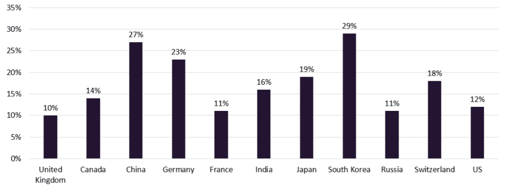 There is a common public view that lowering tariffs particularly with regard to China has contributed to the reduced manufacturing output of developed countries. However, there is no obvious relationship between tariff rates and the percentage of national output covered by manufacturing (source, Brookings Global manufacturing scorecard: How the US compares to 18 other nations, 2018).