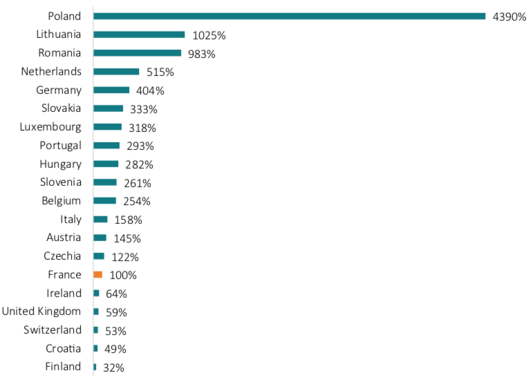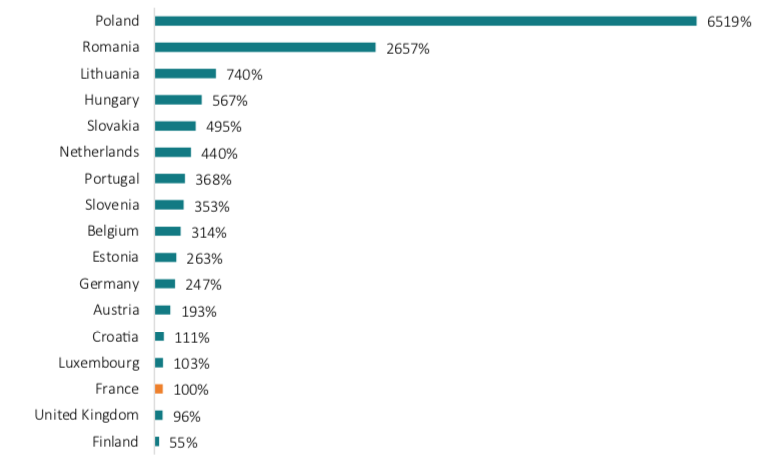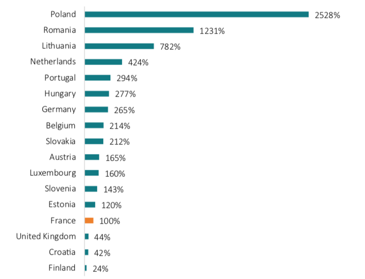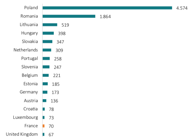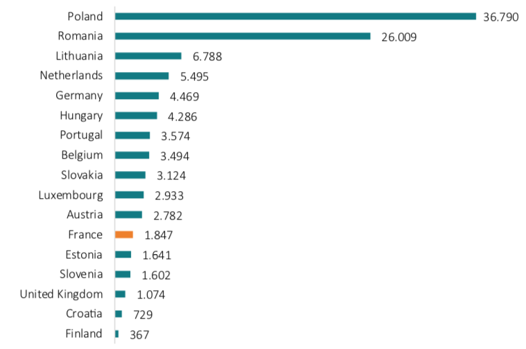 Similarly, Figure 1 outlines that the share of cabotage operations (measured in million tonnes-kilometres) provided by French haulage companies is marginal compared to that of other countries. Polish haulage companies, for example, account for 44 times more cabotage operations than French companies.
