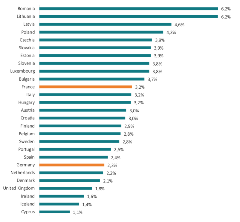 The substantial differences in companies’ actual cabotage operations are mirrored by the number of workers directly affected by market access restrictions on the EU’s road freight transport market. Generally, as outlined by Figure 3, Central and Eastern European countries have a significantly higher share of employment in overall land transport services in total employment. For example, in France, only 3.2% of all employed persons were working in land transport services in 2018, while the share was twice as high in Romania and Lithuania (6.3% each) and also significantly higher in Latvia, Poland, the Czech Republic, Slovakia, and Estonia, reflecting differences in economic development and the structure of economic output. Due to these differences, restrictions on the freedom to provide cabotage services across the EU would indirectly affect a significantly higher share of the labour force in less developed Central and Eastern European countries than in more developed economies, such as France, Germany and the Netherlands. In the EU’s less economically developed countries, further restrictions on freight cabotage would increase pressure on wages and employment in the entire land freight transport sector as it is generally harder for low-skilled workers to find employment in other sectors of the economy. By contrast, in the EU’s more economically developed Western European countries, restrictions on freight cabotage have a lower impact on wages and employment in the transport sector as it is generally easier for low-skilled workers to find employment in other sectors of the economy.