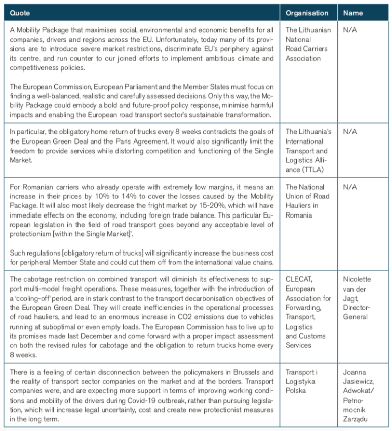 As outlined in Table 3, various industry stakeholders contacted by ECIPE highlight the adverse economic implications of cabotage rules, proposed cooling-off periods and proposed return-to-home policies. Stakeholders caution that restrictions to cross-border transport services in the EU undermine the EU’s economic, social and environmental policy objectives.