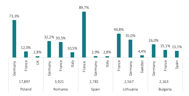 Figure 5. Top 5 cabotage performing countries and their main countries in which cabotage took place in 2017