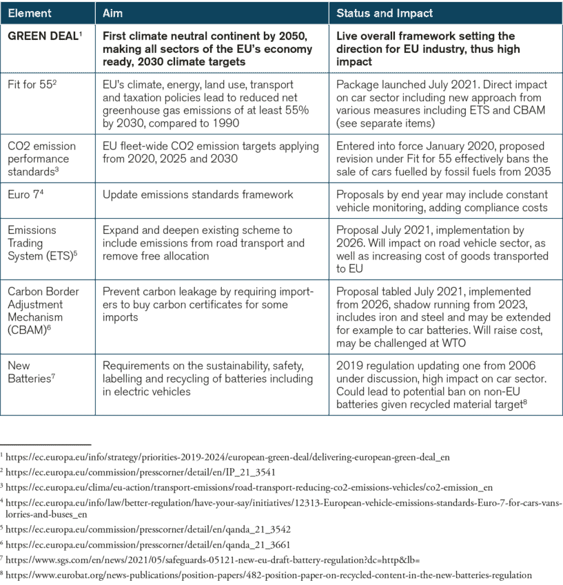 This study considers how best to maintain a globally thriving EU car sector in the face of several interrelated challenges. The climate emergency necessitates a dramatic reduction in emissions to net-zero impacting across the economy, which leads to a fundamental shift in automotive products and therefore manufacturing, given electrification and digitalisation. Moreover, there is a greater emphasis on the need of preserving and restructuring the auto industry in the face of increased competition from the emerging markets, not least China and India. In trade policy, Europe feels the need for a more assertive and autonomous trade policy to protect against perceived imbalances in the current models of globalisation.