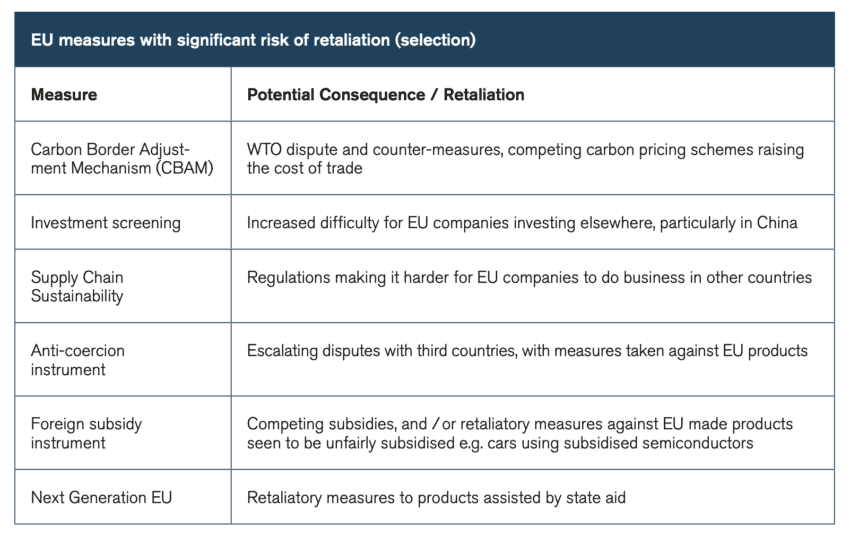 Inevitably, attempts to use EU regulation and state aid to level the playing field are seen by third countries as provocative, and tilting away from an open EU towards protectionism despite our best intentions. We have also seen that trade retaliation could also be asymmetrical, where the counterpart imposes an unrelated instrument against a sector where the EU is particularly vulnerable, such as cars, foods or textiles.