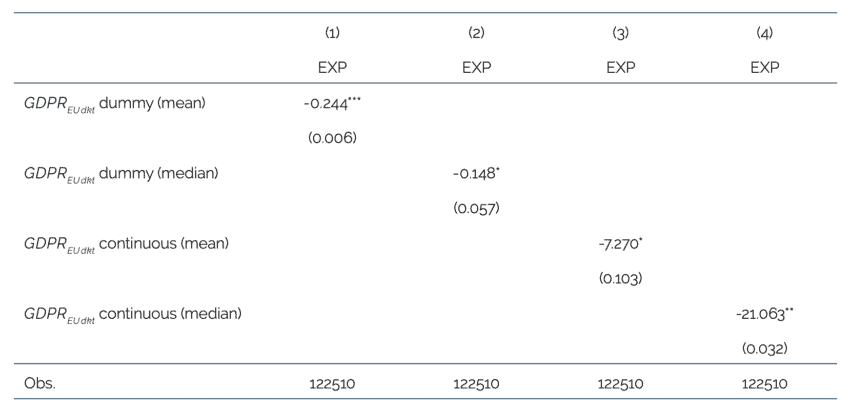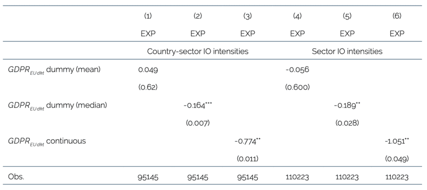 For example, the GDPR’s privacy regulations may make it more difficult for companies to train AI models, which require large and diverse datasets, often sourced internationally, to function effectively. As a result, firms in the EU may choose to relocate parts of their operations outside the EU, potentially reducing exports.[13] Moreover, the GDPR applies not only to data concerning EU citizens but also to all personal data processed within the EU market. This broad scope can hinder the collection and combining of large datasets necessary for AI and other digital technologies. Even when data is held within national borders, compliance costs may render processing prohibitively expensive. Firms may opt to shift parts of the value chain, such as software engineering or data analytics, to lower-cost jurisdictions, not necessarily to avoid the GDPR, but to offset the associated compliance burden. For these reasons, we also regress equation (2) using exports (EXodtk) as our dependent variable.