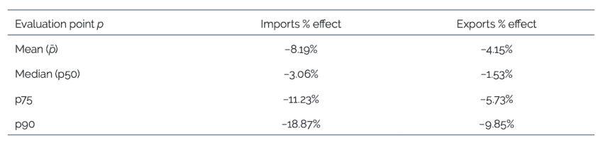 Note: Effects are computed as 100(exp[β ̂⋅p]-1 using the continuous (mean) coefficients from Table 2 col. (3) [imports] use and Table 3 col. (3) [exports]. Imports use β ̂IMP =-14.665; exports use β ̂EXP =-7.270