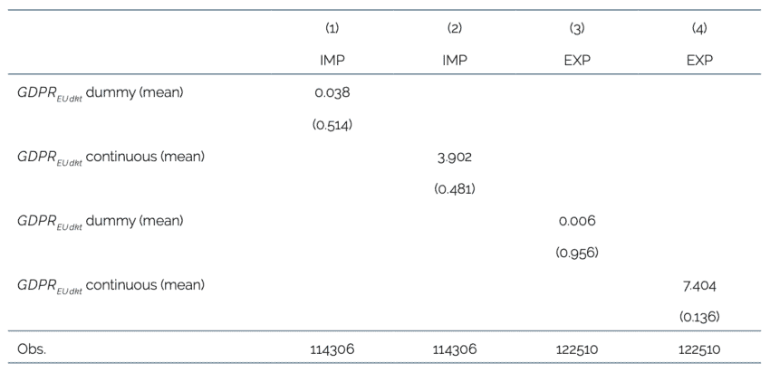 Additionally, equation (2) estimates the effect of the introduction of the GDPR on the EU’s imports, which correspond to partner countries’ exports to the EU market. This trade effect is intuitive, as foreign firms often process the personal data of EU citizens when it is transferred to partner countries that provide digital services back to the EU. However, the GDPR is also likely to impact the EU’s own exports.