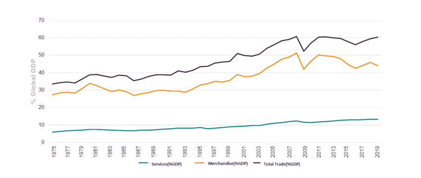 Figure 1: Trade as a % of Global GDP, 1975 – 2019