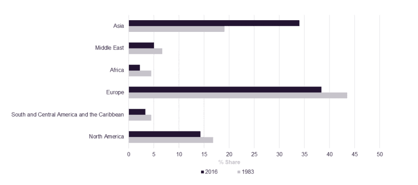 Figure 2: World Merchandise Export % Share by Region, 1983 and 2016