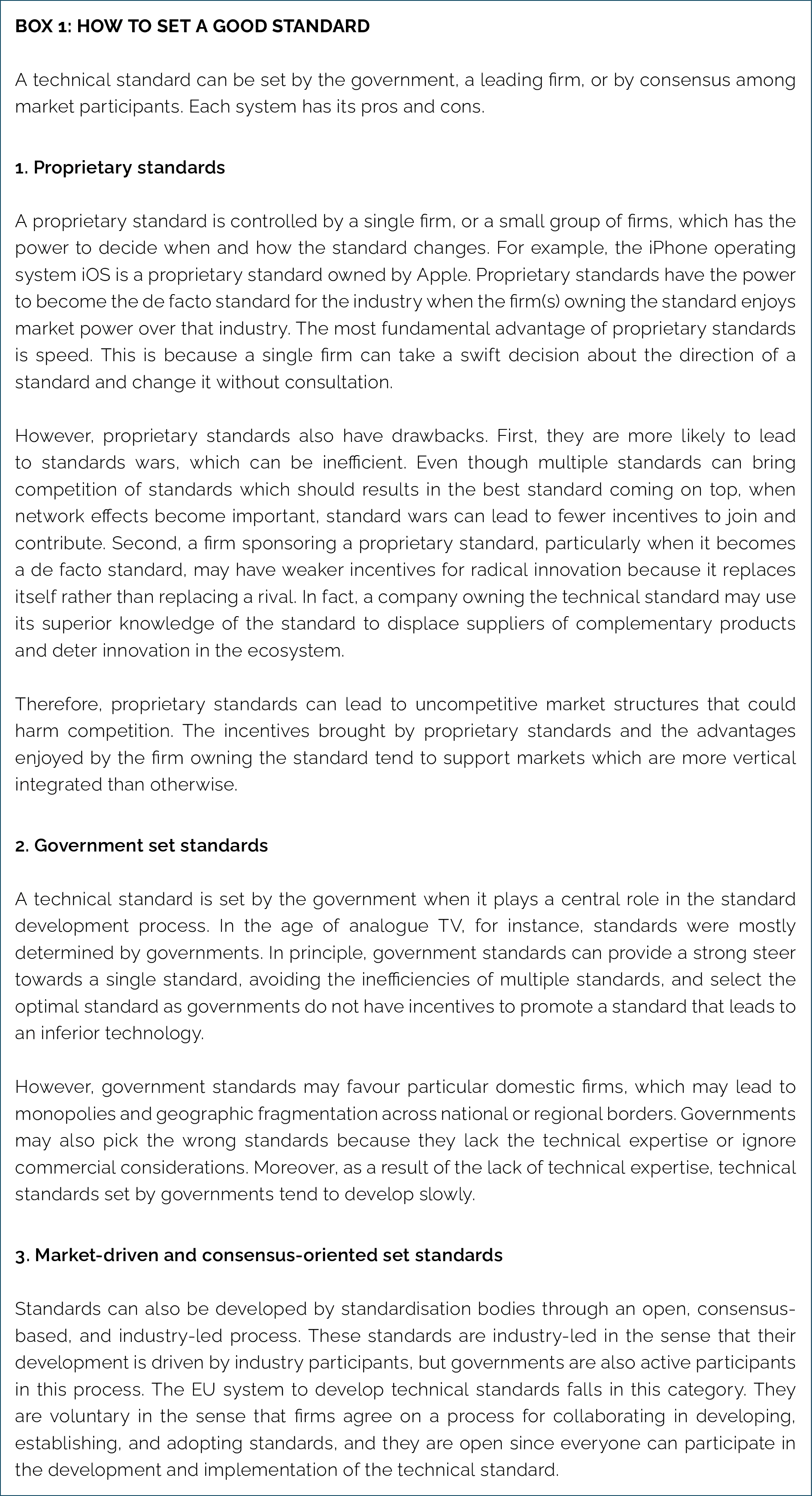 The success of the European standardisation system, which is market-driven and based on consensus, has had significant economic benefits in the development of specific industries, like the European Information and Communication Technologies (ICT). Technical standards in ICT have shaped a European industry that is not only dynamic and international but also enjoys some of the highest levels of wages and Research and Development spending. Moreover, if technical standards are not developed through an open, consensus-based, and industry-led voluntary process, they will be developed in different ways. For instance, governments and private companies can develop standards by themselves. Both solutions are inferior to the current market-driven approach that governs European standards. However, the European market-driven approach to set standards is voluntary, and its success and continuation must not be assumed. European policymakers should be worried about tinkering with a European standardisation system which has produced economic specialisation and innovation to the benefits of EU firms and consumers.