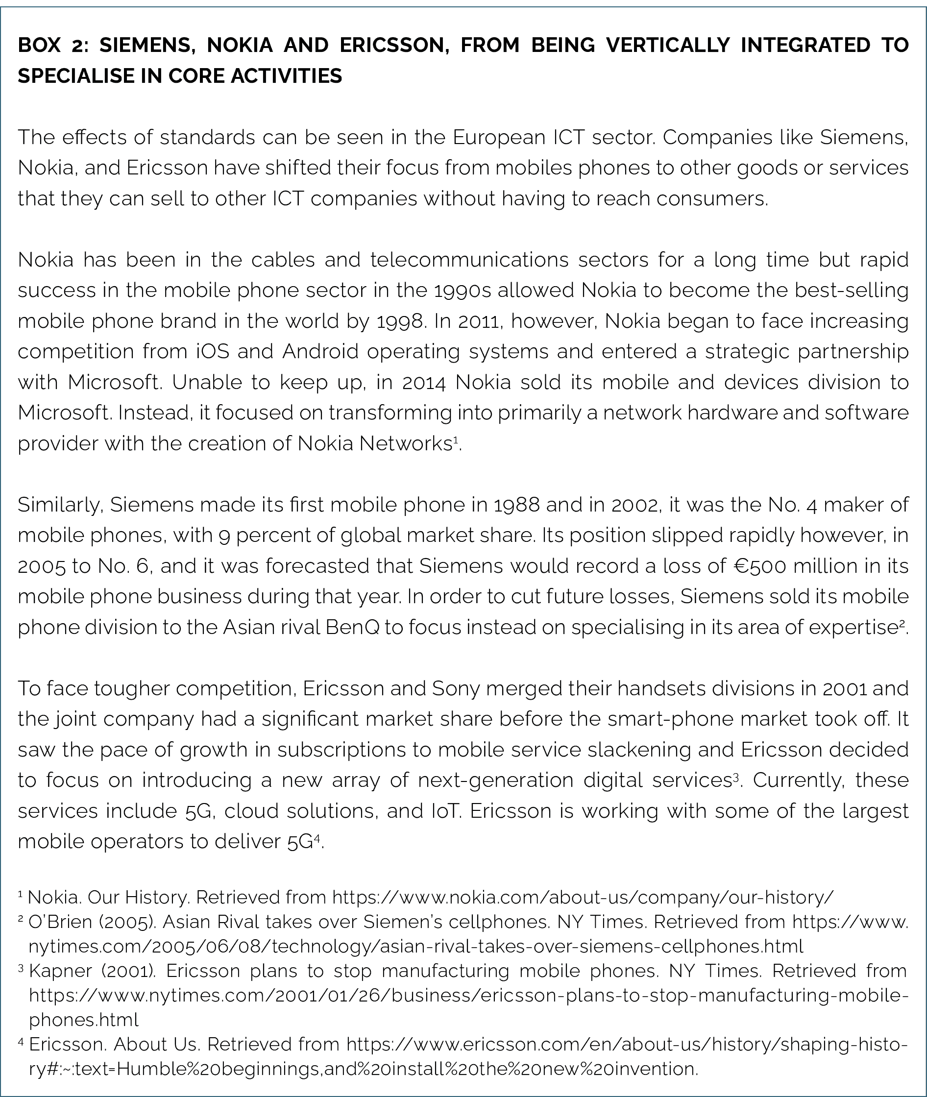 Industry structure will be fundamentally different if innovators typically produce and sell their own products than if they licence the technology underlying them. In the first case, innovation and production will be based in vertically integrated firms. In the second case, licensing of technology allows a more varied industry structure with competition between innovators in the upstream side of the market. This is the case of companies like Nokia, Siemens, and Ericsson which in their corporate strategies have shifted their focus towards their core activities, producing innovations used by other businesses (like consumer-oriented ICT companies or telecommunication companies). This change in strategy would have been impossible without the widespread use of standards. These companies are good examples since they had previously developed consumer goods where their innovations were embedded, and standards have enabled them to change their corporate strategy (See Box 2).
