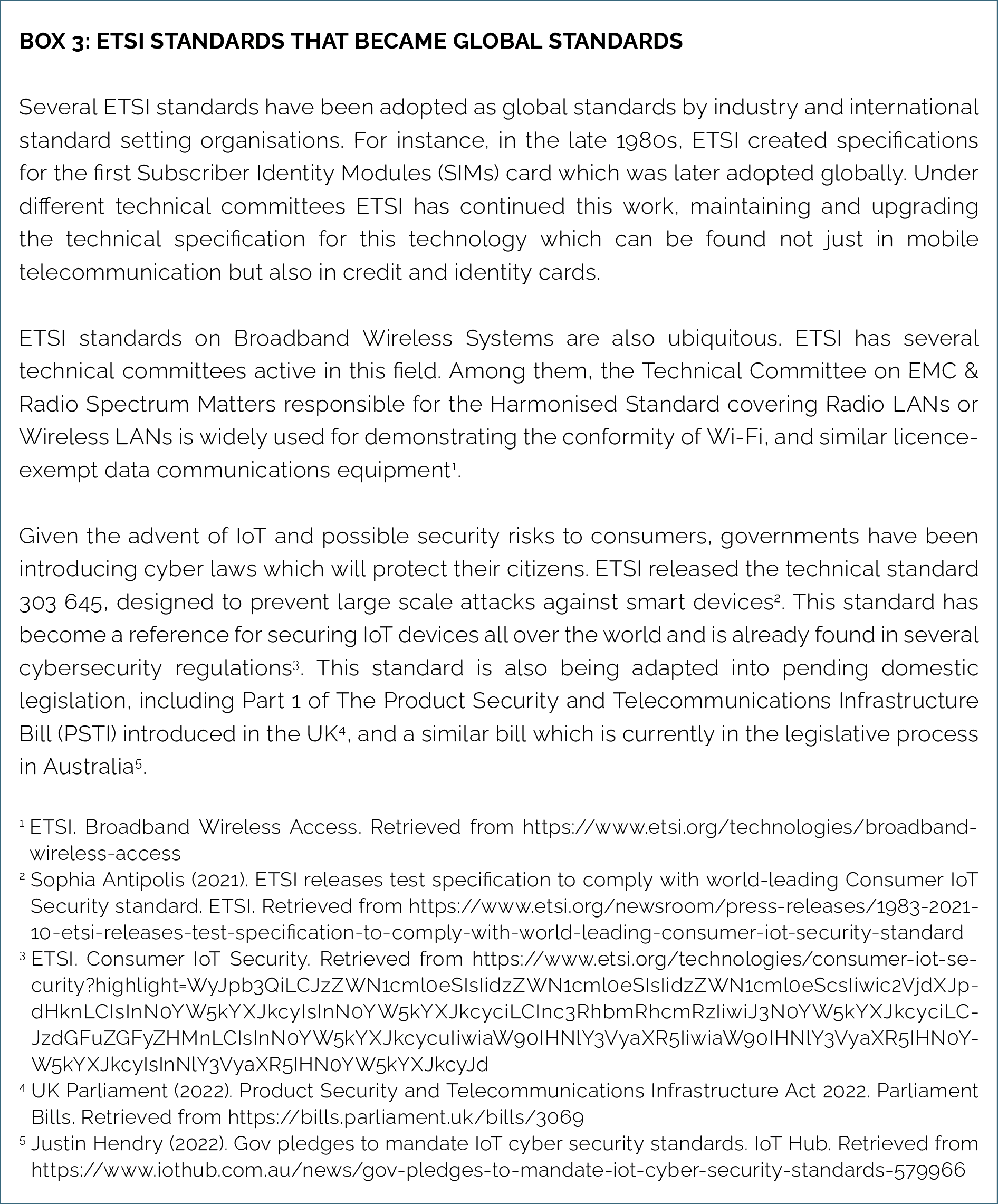 The governance of CEN and CENELEC is not likely to change much as a result of these regulatory changes since NSOs already hold the key – through voting – to each of the milestones that a standard has to pass before it is approved. The situation is different in the case of ETSI. As explained, even if European NSOs have the final say over the adoption of Harmonised Standards, the green line over a standardisation request – including a Harmonised Standard requested by the European Commission – is done by all ETSI’s members not just by the European NSOs. This is partly the result of ETSI’s own success. ETSI’s membership and reach is global rather than European as many of the standards approved by this ESO are adopted worldwide (See Box 3). Moreover, ETSI standards are a crucial part of the architecture that underpins the ICT sector and the economic features described earlier. These considerations are important since the regulatory changes approved in the governance of ESOs could have negative consequences over the EU economy and the role played by ETSI over global standards.