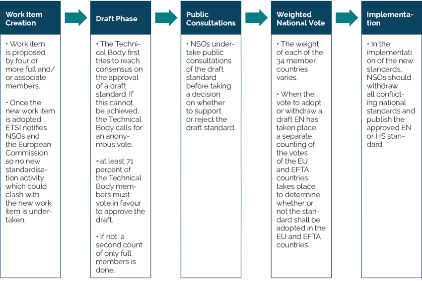 ETSI standardisation work includes other activities apart from developing Harmonised Standards requested by the European Commission. In fact, only 15 to 20 percent of ETSI’s funding comes from the EU[3]. Yet, when it comes to developing Harmonised Standards, ETSI follows a similar pattern of drafting, public enquiry, voting, and implementation than CEN and CENELEC. However, there are some important differences. A new work item should be proposed by four or more full and/or associate members. Full members participate in the Technical Body work and have the right to vote, while associate members cannot vote on European standards. Taking decisions “on matters concerning documents intended for regulatory use by the European Union” and “setting down standardisation policies intended to meet the needs of the European Union” is subject to the approval of a weighted vote of all full members, not only EEA national standardisation organisation[4] as it is the case in CEN and CENELEC.