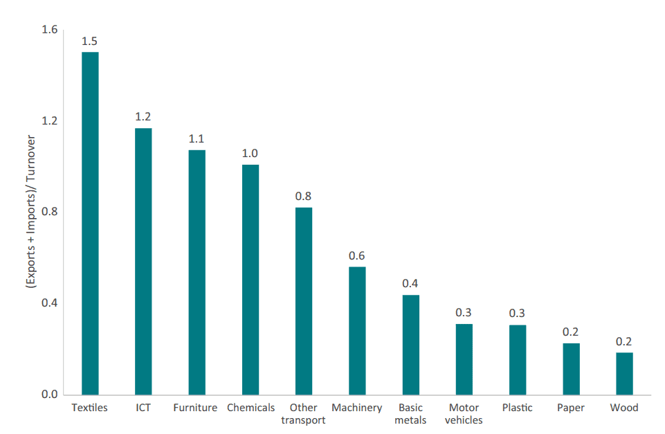 Figure 1: Exports and imports over total turnover across European economic sectors in 2019