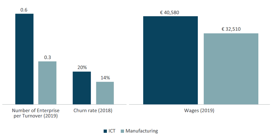 The impact of standards on market structures can be noticed in the business statistics. For example, the European ICT industry, where the use of standards is prevalent, has a larger number of firms per turnover and a higher level of wages than the average manufacturing sectors. Moreover, the European ICT sector is competitive and dynamic. The rate of creative destruction or churn rate – measured as the proportion of companies entering and exiting the sector – is much larger in ICT than in other manufacturing sectors. This is because technical standards, as publicly available and easily accessible documents that describe the technical specification of a product, lower information costs reducing the barriers to entry for new firms into an industry.