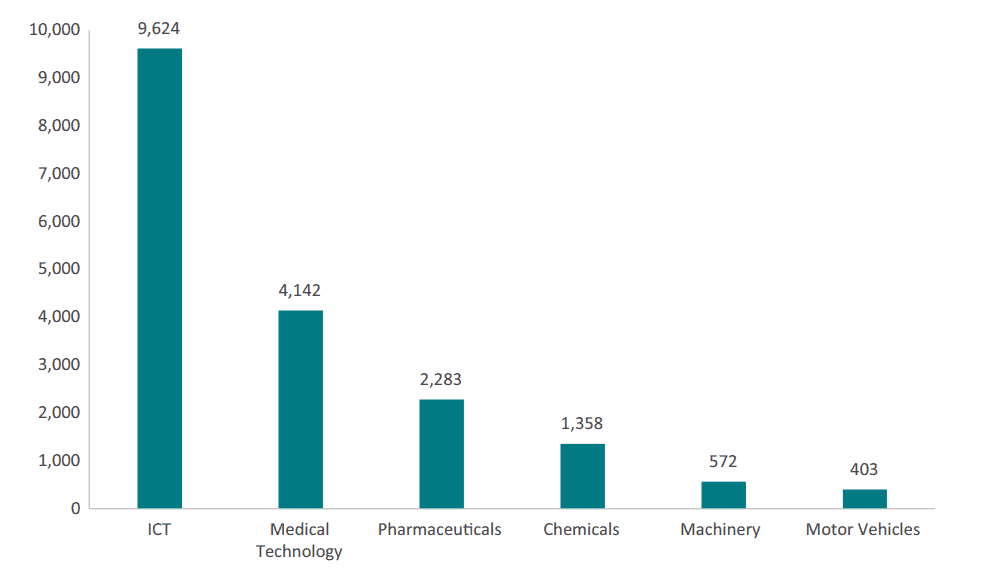 Standards can therefore result in higher levels of R&D and innovation. This is reflected in the large number of patent applications in the ICT sector compared to other manufacturing sectors over the years. In 2018, the ICT sector was the leader in patent applications to the European Patent Office (EPO) with more than nine thousand patents filed. The following sector, medical technologies, filed less than half of those by the ICT sector. Pharmaceuticals, chemicals, machinery, and motor vehicles had considerably lower numbers despite being innovation driven sectors.