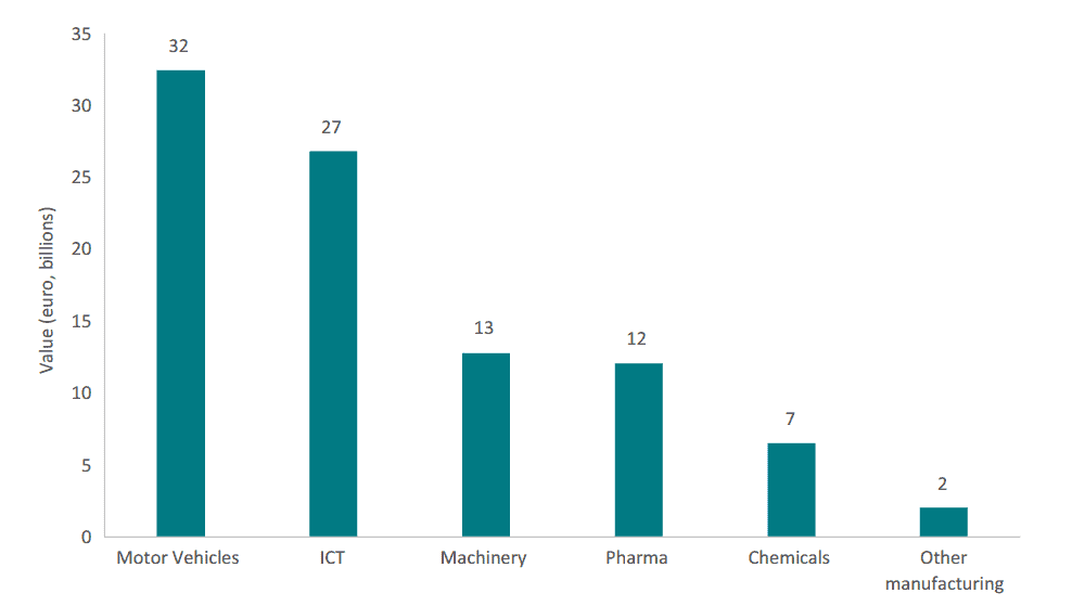 Source: Eurostat, Author’s calculations. Bulgaria, Estonia, France, Cyprus, Ireland, Latvia, Lithuania, Luxembourg, Malta, Netherlands, Poland, Slovakia, Sweden not included due to missing data. The Pharmaceutical industry was not included due to missing data.