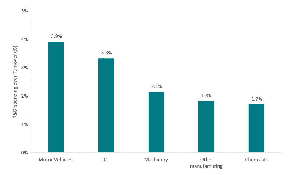 The ratio of business spending on R&D over turnover helps us understand the relative effort made by each sector to push the technological frontier. Figure 5 below shows a relative ranking of sectors similar to the previous graph. Motor vehicles and ICT are not only two of the sectors with the largest spending on R&D (see Figure 4) but also the two economic activities with the highest spending on R&D over their total turnover. Despite this similarity, motor vehicles and ICT have markedly different industry structures. Motor vehicles is a relative integrated sector with suppliers selling mostly to one car manufacturer. The ICT sector is characterised by compatibility and a market for technology which supports a diverse ecosystem of companies with multiple business relationships. And while R&D in motor vehicles was boosted by the significant spending done in Germany, mostly by the large car manufacturers, R&D by the ICT industry was one of the highest across all member states. Technical standards can partly explain this outcome: because standards reduce information costs and trade barriers, they support a more uniform distribution of R&D activities in which firms, across all EU member states, can participate.