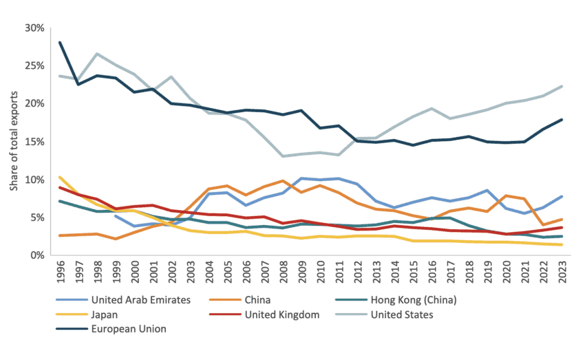 In terms of goods, India had total exports of USD 393 billion in 2023. Since 1996, big, developed economies such as the United States, European Union, and the United Kingdom have managed to maintain their foothold as the largest markets for India’s goods exports. In fact, the US has increased its share of India’s exports substantially since the beginning of the 2010s. China and the United Arab Emirates (UAE) have emerged as important markets for India too (Figure 2). It is notable that none of these countries, barring China, are geographically close to India. This points to a unique characteristic of India’s foreign trade composition – unlike most countries that tend to have stronger trade relations closer to home, India has established major trade partners over longer geographical distances. Part of this is a result of challenging political circumstances in the neighbourhood, but it can also be attributed to India’s preference of trading with large liquid markets.