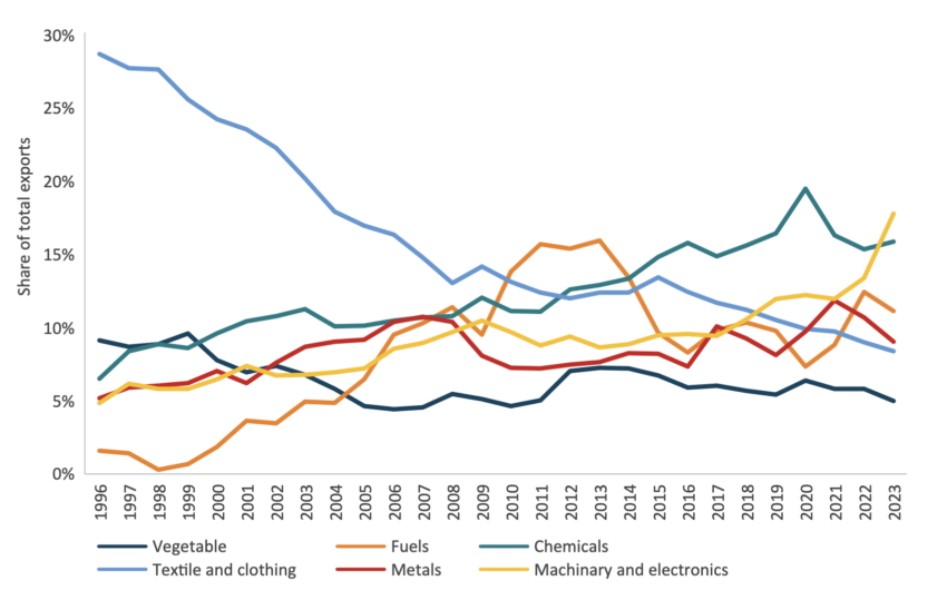 In terms of India’s composition of exported goods, there have been significant changes since the mid-1990s. Sectors such as chemicals as well as stone and glass have remained in the top 5 exported goods. However, while the share for stone and glass has declined from 19 to 12 percent, the share for chemicals has gone up significantly from 6 percent to 16 percent. At the same time, there has been a marked decrease in the exports of lower value-added manufactured goods and raw materials. This includes sectors such as vegetables and hides and skins, but more importantly textiles and garments are no longer in the top five exported sectors. They have been replaced by sectors such as machinery and electronics, and fuels, and metals. In fact, between 1996 and 2023, machinery and electronics have replaced textile and garments as the largest exported sector (Figure 3). With the rise of the chemicals and machinery and electronics sectors in India’s goods exports, there is an obvious conclusion on the rise of India’s exports of higher value-added goods over time. And this increase has come at the expense of lower value-added products, such as agricultural commodities and textiles and garments.