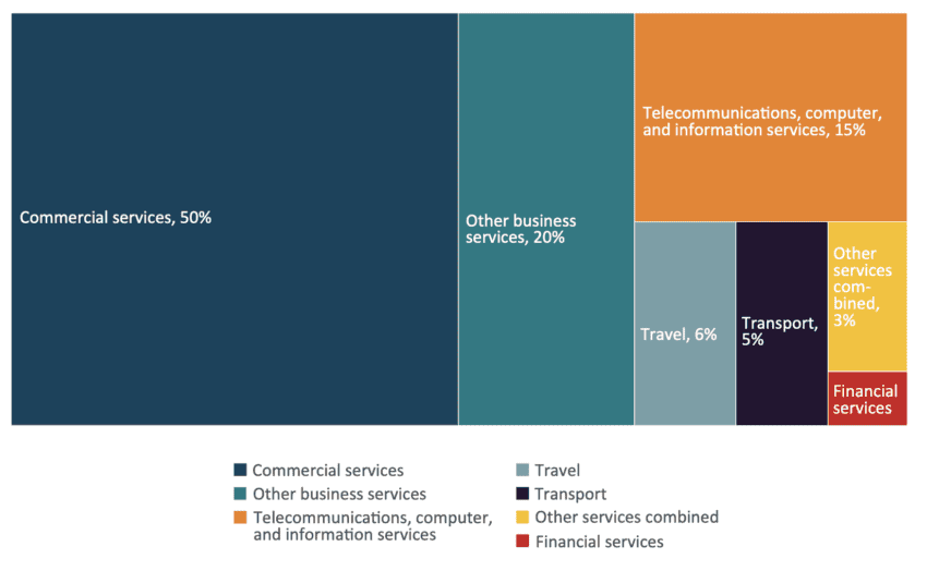 India’s export composition also stands out. It is very notable that India’s exports of services outweigh its exports of goods. Naturally, this reflects India’s domestic composition of a large services sector, but it also points to a strong footing that India has established in newer forms of trade. The main categories of services also share the feature of being high value-added and in activities that usually come with many forward and backward linkages. In other services, the actual export sales are an interface for larger economic integration, and it builds on intense integration in value chains with customers and other services suppliers.