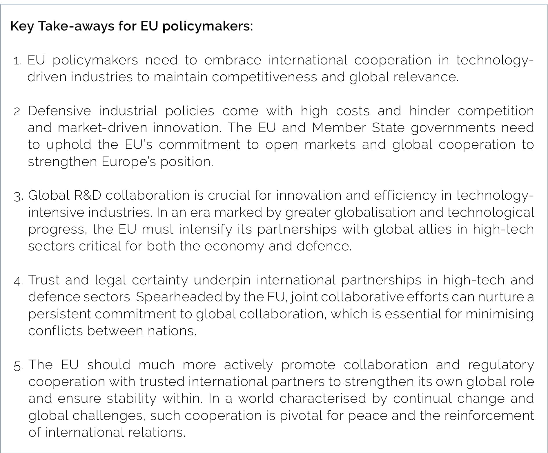 The EU must embrace international cooperation and collaboration in technology-driven industries to ensure competitiveness and global relevance, while also considering the drawbacks of isolationist policies. The EU’s commitment to open markets and global cooperation has historically been its strength, and EU policymakers should continue to prioritise on these principles.