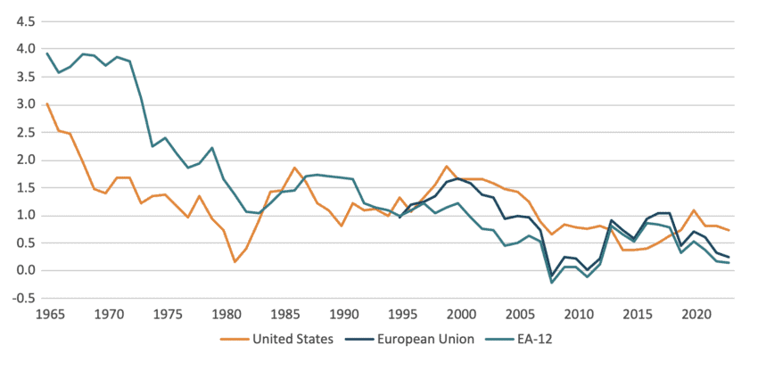 The importance of TFP cannot be understated. As mentioned, TFP is a crucial measure of productivity because it reflects advancements in technology and innovation. Figure 3 illustrates the development of TFP growth in the EU, EA-12, and the US. Since 1965, both the EU and the US experienced a substantial decline in TFP growth, falling from 3 percent in the US and 4 percent in the EA-12 to around 0.5 percent today. However, compared to the US, the EU’s TFP growth took a deeper dive during the Great Financial Crisis and the subsequent sovereign debt crisis in the early 2010s. However, the EU’s TFP slowdown began well before these events, suggesting the presence of deeper structural factors[2].