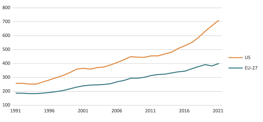The EU has been performing poorly in comparison with the US in terms R&D expenditure. Figure 4 shows domestic expenditure on R&D, expressed in constant PPP dollars. In 1991, US R&D expenditure was almost 40 percent larger than the EU. This gap slowly widened over time until 2011 when the rate of growth of US expenditure in R&D clearly outpaced the EU’s. Between 2014 and 2021, the average year-on-year growth rate in R&D expenditure in the US was almost twice that of the EU, at 5.6 percent against 2.7 percent. As a result, US R&D expenditure in 2021 was 77 percent larger than the EU.