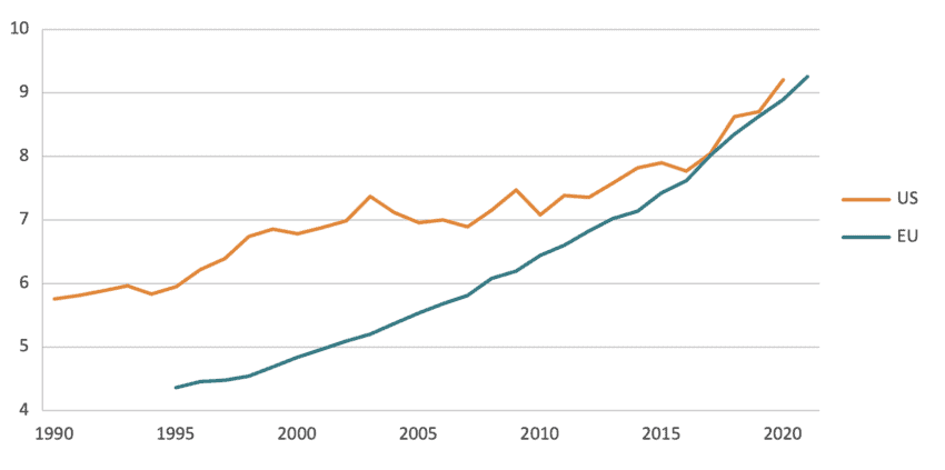 In terms of human capital dedicated to R&D activities, the EU has shown progress in catching up with the US. Figure 5 presents the number of researchers per thousand labour force participants between 1990 and 2021. This metric includes those directly employed in the R&D sector and those involved in fundamental research, such as academia. The data reveals an increase in the EU’s research workforce: the ratio of researchers per 1,000 economically active individuals rose from above 4 in 1995 to more than 9 in 2021. The US also experienced growth, with the number of researchers relative to its labour force increasing from close to 6 to above 9. Since 2015, the US rate of researchers accelerated, matching the trend experienced in the EU.