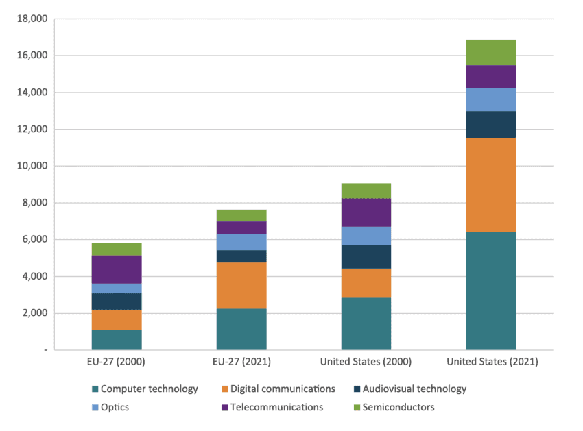 While patent quantity is a metric, it is important to acknowledge that not all patents hold equal weight in terms of innovation. A more granular analysis of patent applications in key complex and critical technologies reveals that the EU also lags behind the US. The European Commission examined the total number of patent applications across six technological fields: computer technology, digital communications, audiovisual technology, optics, telecommunication, and semiconductors[1]. Figure 7 shows that the EU has fallen behind the US in these technologies. Moreover, the gap between the two regions has widened over time. In 2021, the US boasted 86 percent more patent applications in complex technologies compared to the EU, a stark contrast to the 30 percent difference observed in 2000. This divergence can be attributed to the robust growth in US patents for computer technology, digital communication, and, to a lesser extent, semiconductors.