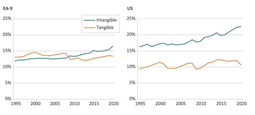 The importance of intangible capital in nine Euro area countries and the US is illustrated in the next figure. While investment in tangible assets has kept pace with economic growth, investment in intangible assets has grown significantly faster. As a result, investments in intangibles were larger than in tangible assets in both regions. However, while this trend has been apparent in the US for some time, it was not until the late 2000s that intangible investments in the EA-9[5] surpassed investments in tangible assets. As a percentage of the economy, investment in intangible capital was larger in the US (23 percent) than in the EA-9 (17 percent).