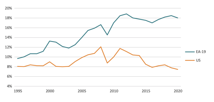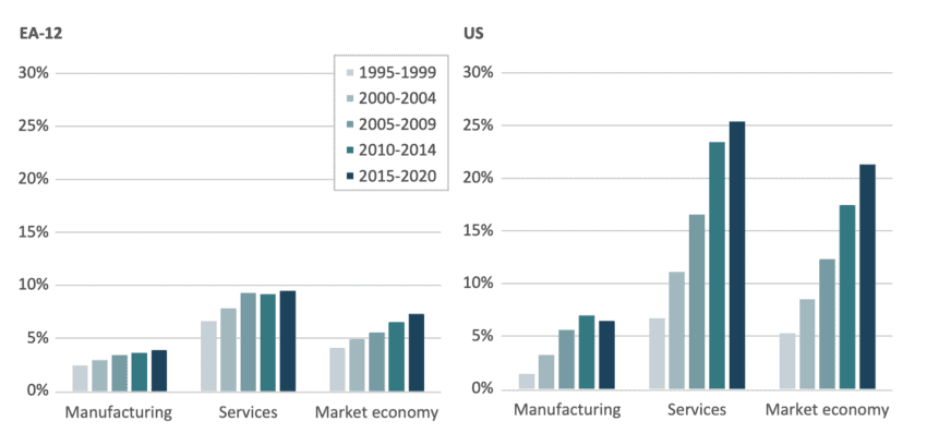 Figure 10 shows that the US has been investing in ICT-related capital much more than Europe. This is particularly visible for services, which include digital intensive sectors such as ICT services but also finance and marketing sectors. During the 1995-1999 period both the EA-12 and the US invested between 4 and 5 percent of non-residential capital into ICT equipment. But by 2015-2020, this number increased by almost 16 percentage points in the US, while it went up by just 3 percentage points in Europe.