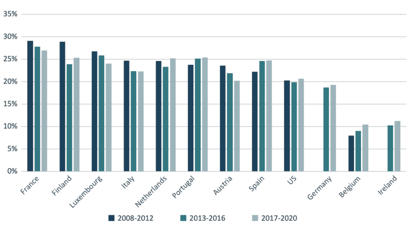 The role of young firms, especially in innovation sectors, also plays a central role in explaining the innovation deficit of the EU relative to the US. Figure 14 shows the share of startups over time, as a proportion of all enterprises for eleven EU countries and the US between 2008 and 2020. The proportion of startups, defined as firms less than two years old, is larger in many European countries than in the US. However, while this percentage has stayed relatively constant in the US, it has declined in France, Finland, Luxembourg, Italy, and Austria. Research has shown that US young firms have persistently been able to realise higher returns to R&D compared to EU firms, which explains why such firms are inexistant in high innovation and technology intensive sectors in Europe.[13]