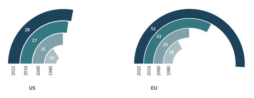 Trade openness measures how connected a country’s economy is to the global market. It is calculated as the ratio of a country’s total trade in goods and services (both imports and exports) to its GDP. A high trade openness indicates that a country’s trade is a significant part of its economy. Conversely, a country with limited trade would present lower levels of trade openness. The figure below showed that for several decades EU and US trade openness were at similar levels. However, while US trade openness showed small increases over time, the EU’s trade openness grew much more and stood at 51 percent of GDP in 2022[14].