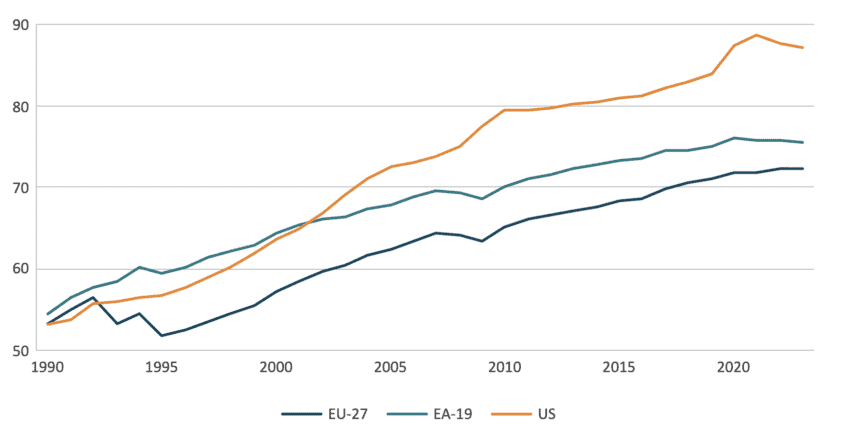 This point is particularly relevant when analysing the relative economic performance of the EU and the US. In recent years, the US’s economic performance has enjoyed a boost from significant fiscal stimulus, lower energy prices, and a strengthened US dollar. However, a long-term analysis reveals that, while these factors have recently exacerbated the divergence in EU-US growth rates, the widening prosperity gap between the two regions reflects a longer-term trend.