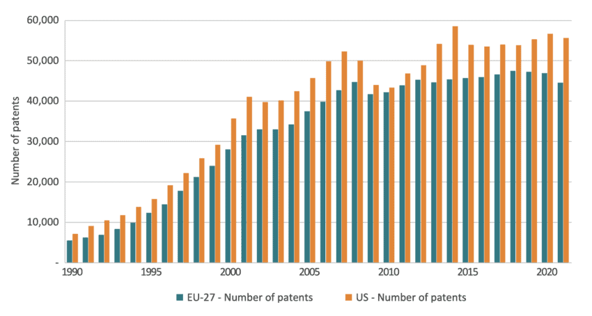 Figure 6: Number of technology patents and share of total technology patents in the EU-27 and the US, 1990-2021