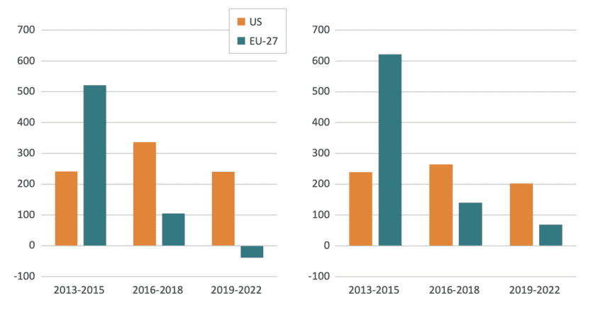 Figure 17 illustrates FDI trends in the EU and the US using data on aggregate FDI flows in billion euros. The figure is divided in two parts: inward FDI (left panel) and outward FDI (right panel). Inward FDI refers to investments from other countries into the EU and US, while outward FDI represents investments from the EU and US into other countries.