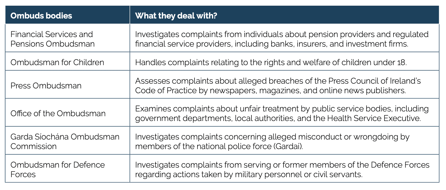 For example, the FSPO resolves around 2,000 complaints per year[21] and, on average, it issues close to 400 legally binding decisions of which around half are upheld fully or partly in favour of the complainant.[22] Examples of complaints that are handled include disputes over interest rates, the assessed value of stolen property, and the rejection of insurance claims. The table below presents a list of Irish Ombuds bodies in different sectors and areas of public policy.