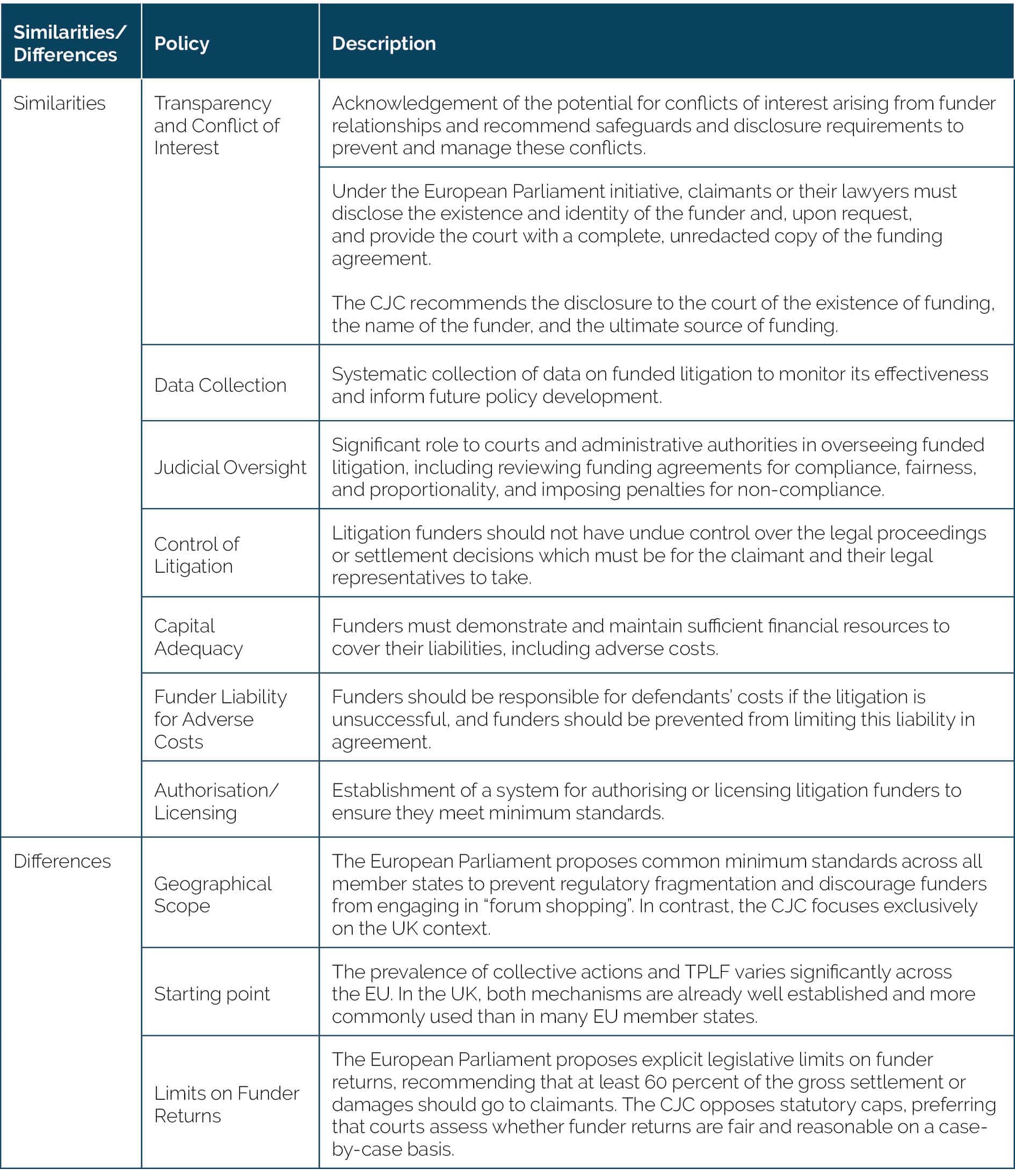 Table 8: Policy proposals on Third-Party Litigation Funding from the European Parliament and UK Civil Justice Council