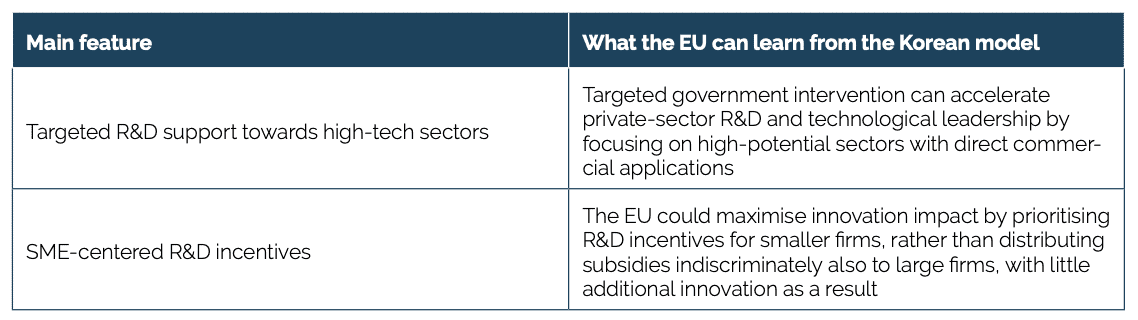 - The South Korean model: South Korea has successfully used industrial policy to promote R&D in high-tech sectors. Its G7 Programme in the 1990s provided targeted research subsidies to encourage private firms to invest in cutting-edge technologies. The country also employs highly differentiated R&D tax incentives, favouring small firms that are more responsive to innovation policies.