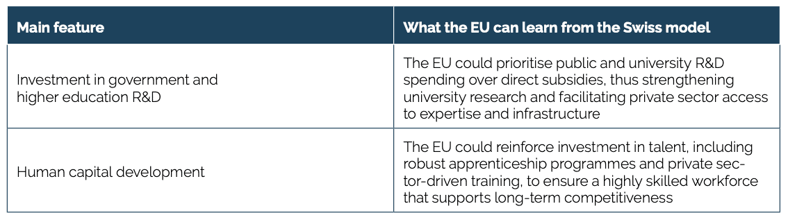 - The Swiss model: Switzerland relies on strong public investment in research and higher education rather than direct industry subsidies. It maintains a highly innovative economy by fostering collaboration between universities, businesses, and research institutions, making it one of the world’s most innovation-driven economies.
