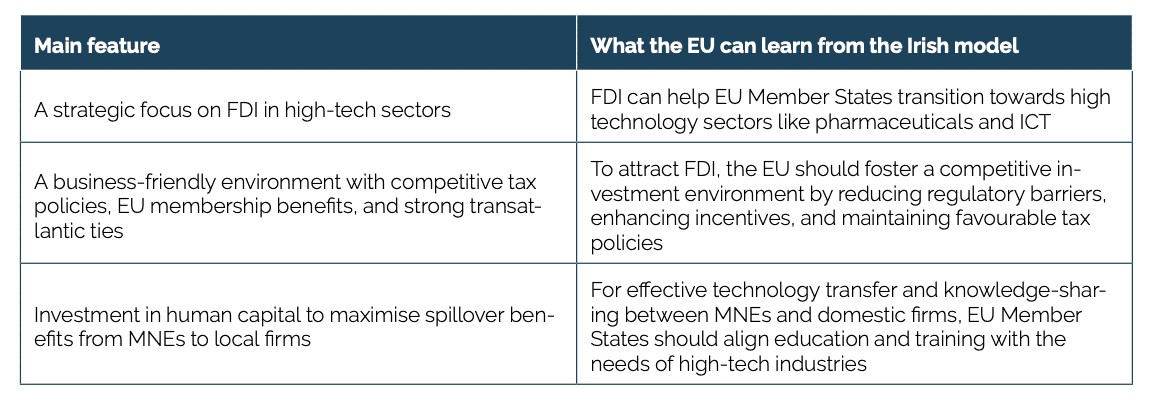One notable exception to this trend is Ireland. The Irish economic model has relied heavily on inward FDI and on the allocation of these investments to higher-value-added activities. As a result, these resources have transformed Ireland into one of the most successful, productive, and prosperous economies in the EU.