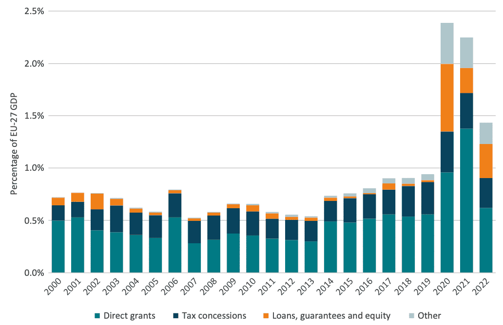 Europe’s approach to industrial policy has undergone a dramatic transformation in recent years, with state aid reaching 1.4 per cent of GDP in 2022, levels unseen since the early 1990s. While advocates of substantial state aid argue that this intervention is necessary to maintain competitiveness in a world where the US and China are implementing large-scale industrial strategies, the effectiveness of this approach remains contested.