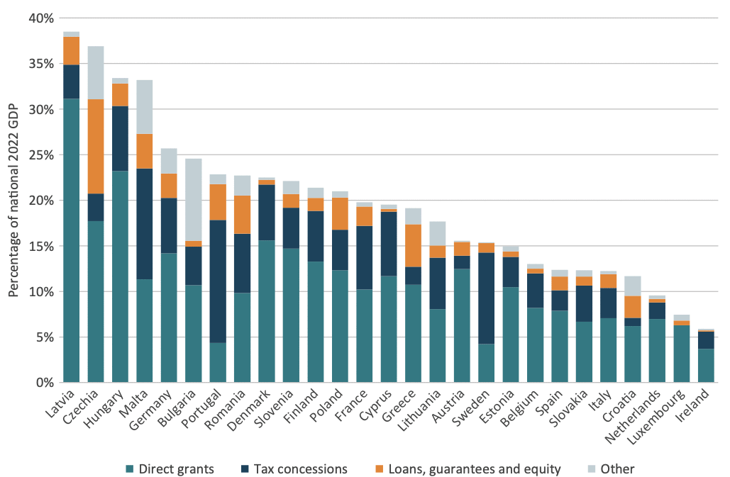 Moreover, while the chart highlights considerable variation in the mix of state aid instruments used across EU Member States, one trend stands out: in 24 out of 27 countries, direct grants represent the largest single component of state aid. Only Malta, Sweden and Portugal diverge from this pattern, with the latter two in particular prioritising tax-based state aid over direct cash transfers to businesses.